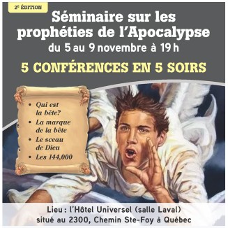 Le point de départ sera le message des 3 anges que l’on retrouve au chapître 14 de l’Apocalypse. À la fin des 5 soirs de ce séminaire, les participants seront à même de bien comprendre ce message solennel qui doit être proclamé haut et fort à tous les habitants de la terre. Et bien plus encore.